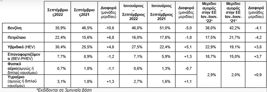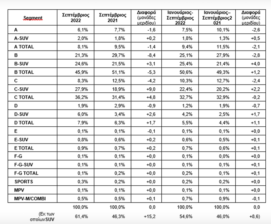 Σύμφωνα με πρώτους υπολογισμούς, η πρόοδος στα segments επιβατικών και στην κατανομή ανά καύσιμο, ως και τον Σεπτέμβριο, έχει ως εξής: