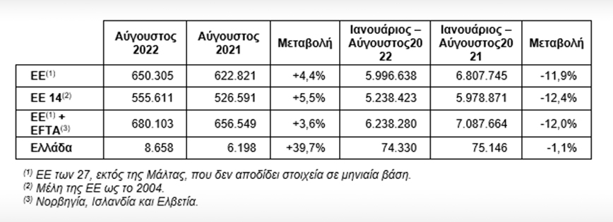 Πάντως, σε επίπεδο ΕΕ, με βάση τα στοιχεία του Ευρωπαϊκού Συνδέσμου Κατασκευαστών Αυτοκινήτων (www.acea.be), η αγορά των επιβατικών για το 8μηνο του 2022 παραμένει πτωτική με ποσοστά άνω του 10% και τον περασμένο Αύγουστο κινήθηκε ως εξής: