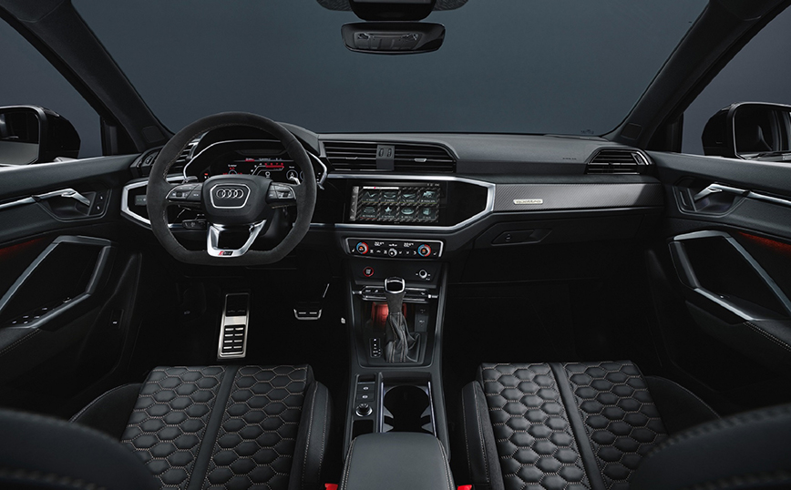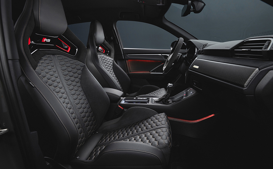Οι επιβάτες κάθονται στα νέα μπάκετ καθίσματα RS που έχουν δημιουργηθεί αποκλειστικά για αυτή την έκδοση. Η επένδυση της πλάτης των καθισμάτων σε ματ Carbon, η οποία χρησιμοποιείται για πρώτη φορά στο RSQ3, είναι ένα ιδιαίτερο σημείο αναφοράς. Τα μπάκετ καθίσματα είναι επενδυμένα με συνδυασμό δέρματος και Dinamica σε μαύρο και jet black χρώμα. Η επένδυση Dinamica διαθέτει μικροϊνες, οι οποίες προέρχονται κατά περίπου 45% από ανακυκλωμένα μπουκάλια PET. Εκτός από τα καθίσματα, το ίδιο υλικό χρησιμοποιείται επίσης και στον πίνακα οργάνων. Οι ραφές σε απόχρωση χαλκού, οι οποίες επαναλαμβάνονται σε όλο το εσωτερικό, δημιουργούν μια ιδιαίτερη αντίθεση. Αυτό ισχύει, για παράδειγμα, για τις κυψελοειδείς ραφές στο κέντρο του καθίσματος, το κεντρικό υποβραχιόνιο, το υποβραχιόνιο των θυρών, το τιμόνι (διατίθεται είτε σε στρογγυλή έκδοση είτε flatbottom), όπως και για τα μαύρα πατάκια με τα κεντημένα λογότυπα «RS Q3». Η έκδοση «edition 10 years» διαθέτει επίσης διακοσμητικά ένθετα από carbon, όπως το κάλυμμα της πλάτης του καθίσματος σε ματ φινίρισμα. Η οθόνη MMI έχει carbon εμφάνιση, ενώ στην οθόνη αφής 10,1 ιντσών περιλαμβάνεται ο σειριακός αριθμός «1 of 555». Όταν ανοίγουν οι πόρτες, τα φωτιζόμενα διακοσμητικά μαρσπιέ των θυρών προβάλλουν ένα κόκκινο 3D διαμαντένιο μοτίβο στο έδαφος.
