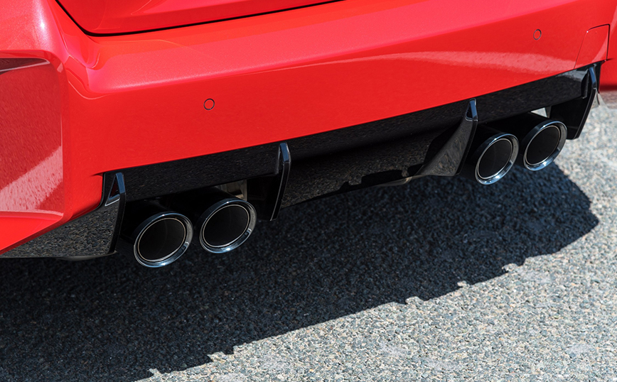 Η μεγάλη, χωρίς πλαίσιο, μάσκα με τις οριζόντιες μπάρες της, συνδυάζεται με μια κάτω εισαγωγή αέρα τριών τμημάτων με σχεδόν ορθογώνιο περίγραμμα που χαρίζει στο εμπρός τμήμα του αυτοκινήτου την γνώριμη εμφάνιση M. Η σχεδίαση έχει γίνει με γνώμονα τις τεχνικές απαιτήσεις σε επίπεδο παροχής αέρα ψύξης και αεροδυναμικής ισορροπίας. Το πίσω μέρος είναι επίσης compact, με μερικές χαρακτηριστικές πινελιές όπως το ενσωματωμένο στο χείλος του πορτμπαγκάζ σπόιλερ, τα κάθετα διατεταγμένα κάτοπτρα, ο ενσωματωμένος στην πίσω ποδιά διαχύτης και τα δύο ζεύγη απολήξεων του συστήματος εξαγωγής που τοποθετούνται μακριά από τα εξωτερικά άκρα.