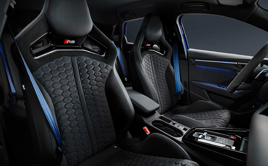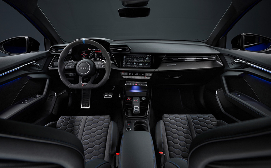 Η ειδική έκδοση δηλώνει τη μοναδικότητά της και στο εσωτερικό. Για πρώτη φορά στο RS 3 τα μπάκετ καθίσματα διατίθενται ως βασικός εξοπλισμός, εξασφαλίζοντας εξαιρετική πλευρική στήριξη στις στροφές. Το κεντρικό πάνελ των καθισμάτων έχει μπλε κυψελωτή ραφή δημιουργώντας χρωματική αντίθεση. Το υλικό που χρησιμοποιείται σε αυτό είναι ύφασμα μικροϊνών Dinamica, το οποίο συνδυάζεται με δέρμα Nappa στα πλαϊνά στηρίγματα. Η μεγάλη επιγραφή RS κάτω από τα προσκέφαλα και το ματ ανθρακόνημα στην πλάτη των καθισμάτων, τονίζουν τον σπορ χαρακτήρα της ειδικής έκδοσης. Μπλε απόχρωση έχουν επίσης οι ζώνες καθώς και οι ραφές στο κεντρικό υποβραχιόνιο, στα χερούλια των πορτών και στο τιμόνι. Το ίδιο ισχύει και για τα πατάκια αλλά και το κάλυμμα του πορτμπαγκάζ το οποίο φέρει επίσης την επιγραφή RS. Τέλος, το flat-bottom τιμόνι με επένδυση Alcantara διαθέτει μπλε σήμανση στη θέση 12:00.