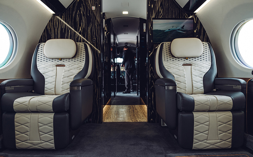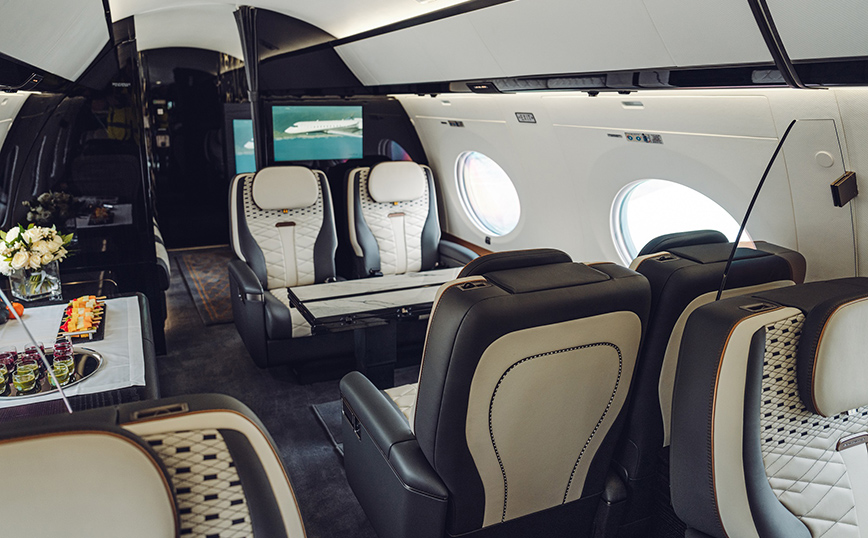 Στο εσωτερικό της καμπίνας, τα ειδικά διαμορφωμένα καθίσματα των Gulfstream G650 και Sikorsky S-76, με τις εξωτερικές ραφές και τις δερμάτινες επενδύσεις Linen και Beluga, ακολουθούν πιστά τα αντίστοιχα της Bacalar.