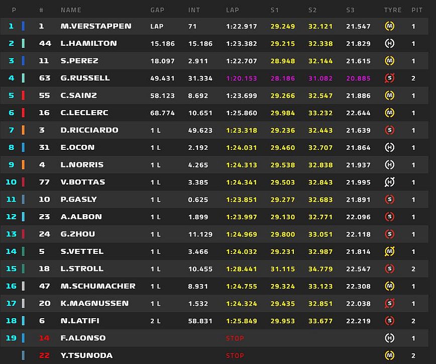 O Τζορτζ Ράσελ ήταν 4ος, παίρνοντας και τον ταχύτερο γύρο στο τέλος. Ακολούθησαν οι Σάινθ, Λεκλέρ, Ρικάρντο, Οκόν, Νόρις και Μπότας.