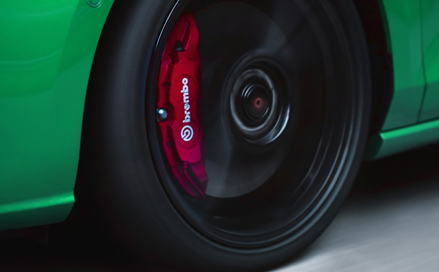 Η απόδοση του συστήματος πέδησης είναι επίσης βελτιστοποιημένη. Οι εμπρός δίσκοι είναι κατά 10% μεγαλύτεροι σε διάμετρο σε σχέση με τους στάνταρ των 330 χλστ και συνδυάζονται με σταθερές δαγκάνες τεσσάρων εμβόλων της Brembo για βελτιωμένο φρενάρισμα και παροχή μεγαλύτερης επιφάνειας για ταχύτερη διάχυση της θερμότητας – μειώνοντας έτσι το φαινόμενο της πτώσης της απόδοσης που προκαλείται από την αύξηση της θερμοκρασίας των φρένων κατά την οδήγηση στην πίστα.