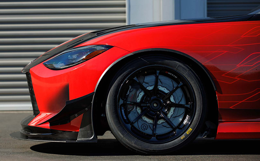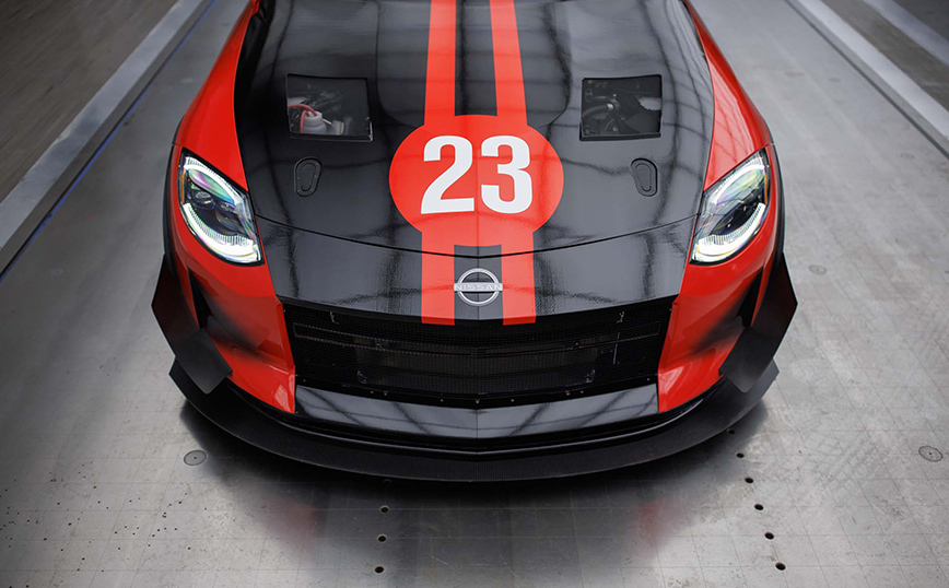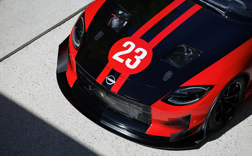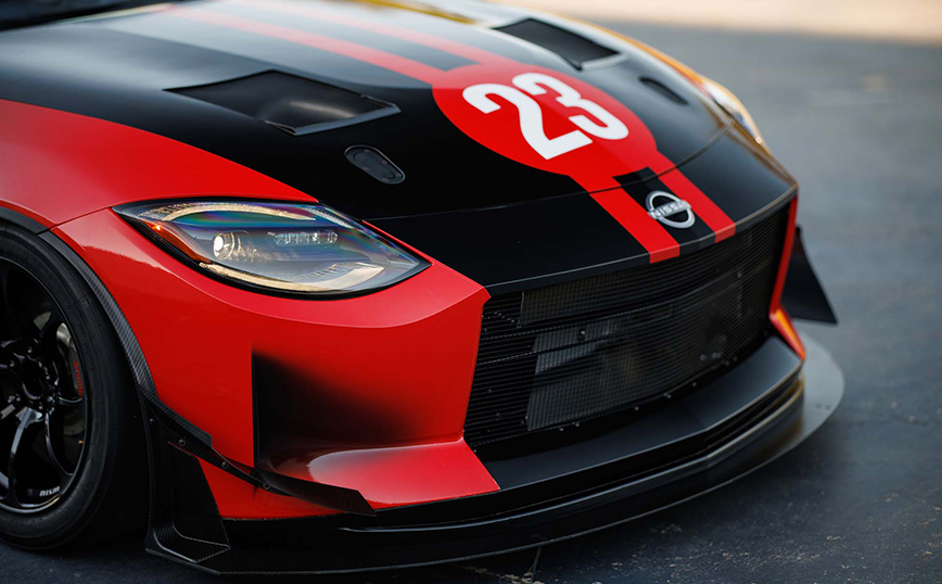 Το ειδικά κατασκευασμένο Nissan Z GT4 για τη SEMA, που αποκαλύφθηκε για πρώτη φορά στα τέλη Σεπτεμβρίου στα γνώριμα χρώματα της NISMO, διαθέτει ένα μοναδικό χρώμα που «δένει» την παλαιότερη vintage αγωνιστική κληρονομιά με τη μοντέρνα σχεδίαση. Το μπροστινό καπό απεικονίζει τον αριθμό 23, τον αποκλειστικό αριθμό της μάρκας, αποτυπωμένο μέσα σε έναν κύκλο ανατέλλοντος ηλίου που θυμίζει την πολύ πρώιμη αγωνιστική δράση της δεκαετίας του ’70. Επιπλέον, τα νέα λογότυπα Z στο πίσω τέταρτο του πλαισίου, υπογραμμίζουν τη σύγχρονη ερμηνεία των αρχικών σημάτων 240Z και Fairlady Z, όλα αρμονικά πλαισιωμένα από τον εμβληματικό κόκκινο και μαύρο συνδυασμό χρωμάτων της Nissan και της NISMO.