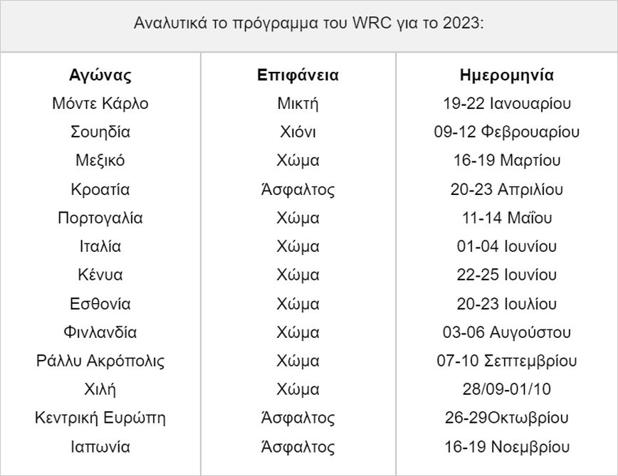 Αναλυτικά το πρόγραμμα του WRC για το 2023 έχει ως εξής:
