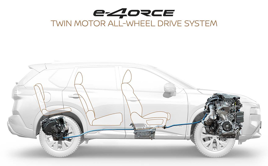 Το καινοτόμο σύστημα τετρακίνησης e-4ORCE σχεδιάστηκε για χρήση είτε στα αμιγώς ηλεκτρικά συστήματα κίνησης, είτε με το πρωτοποριακό σύστημα e-POWER. Και στις δύο περιπτώσεις, οι τροχοί κινούνται αποκλειστικά από ηλεκτρικούς κινητήρες που τροφοδοτούνται από την μπαταρία.