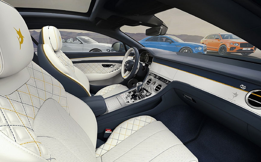 Στο εσωτερικό, ο συνδυασμός γυαλιστερών ανθρακονημάτων και οι καπιτονέ δερμάτινες επενδύσεις σε απόχρωση Beluga αναδεικνύουν τη λάμψη κοσμήματος που έχουν οι αεραγωγοί, το πλαισίων του πίνακα οργάνων και τα χειριστήρια από γυαλισμένο μέταλλο. Αυτή η χρωματική παλέτα δημιουργεί μια έξοχη αντίθεση με τις διακοσμητικές προσθήκες σε απόχρωση Klein Blue στα καθίσματα και περιμετρικά στα πατάκια. Δέρμα σε απόχρωση Klein Blue χρησιμοποιείται επίσης στην επένδυση του κάτω μπράτσου του τιμονιού και στον επιλογέα ταχυτήτων.