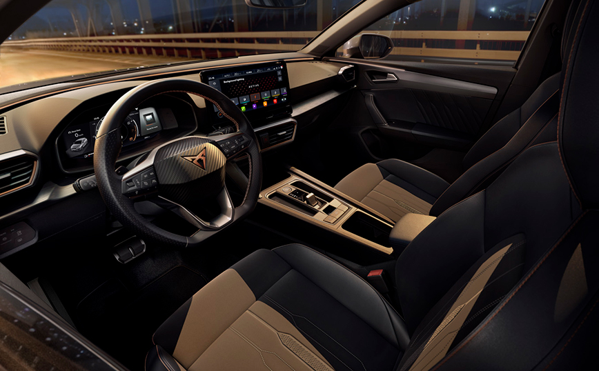 Στο εσωτερικό, το αυτοκίνητο θα διατίθεται με υφασμάτινα καθίσματα Cupra Sports και προαιρετικά με δερμάτινα καθίσματα bucket που συμπληρώνονται από το ταμπλό με ραφές, όλα σε χρώμα Petrol Blue ή μαύρο.