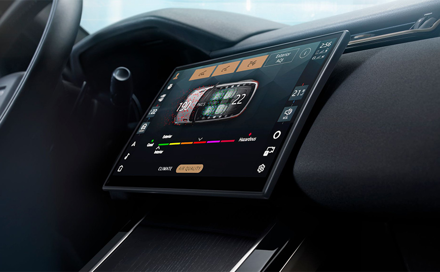 Το νέο Velar διαθέτει την επόμενη γενιά του συστήματος infotainment PiviPro 7. Ενσωματώνει τα χειριστήρια για όλες τις βασικές λειτουργίες του οχήματος στη νέα κυρτή γυάλινη οθόνη αφής 11,4 ιντσών, που μοιάζει σαν να αιωρείται. Τα χειριστήρια για τον κλιματισμό, τα καθίσματα και την ένταση του ήχου είναι πάντα ορατά και στις δύο πλευρές της οθόνης με τη μορφή νέων πλευρικών μπαρών, με συρόμενα χειριστήρια πολλαπλών λειτουργιών σε κάθε πλευρά. Αυτά τα εικονικά κουμπιά είναι πάντα ορατά και παρέχουν άμεση πρόσβαση σε στοιχεία που χρησιμοποιούνται συχνά, όπως τα επιμέρους χειριστήρια της θερμοκρασίας για τους εμπρός επιβάτες, της έντασης του ήχου και των προγραμμάτων του Terrain Response. Το Pivi Pro7 υποστηρίζει την εύκολη συνδεσιμότητα ενός smartphone με το ασύρματο Apple CarPlay. Υποστηρίζεται επίσης το ασύρματο Android Auto, ενώ η ασύρματη φόρτιση συσκευών (από ένα νέο αποθηκευτικό χώρο στην κεντρική κονσόλα) παρέχει άμεση γρήγορη φόρτιση και μειώνει την ανάγκη για καλώδια.