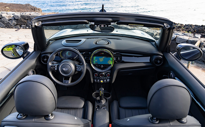 Πέραν των πολλών ακόμα χαρακτηριστικών, στον εξοπλισμό υψηλής ποιότητας του cockpit προστίθενται οι υπηρεσίες eDrive. Αυτές παρέχουν στον οδηγό πληροφορίες σχετικά με την τρέχουσα κατανάλωση ενέργειας, την αυτονομία και συμβουλές για οικονομικό τρόπο οδήγησης. Όλες οι βασικές πληροφορίες συνοψίζονται στο Head-Up Display κατά την οδήγηση. Σε μακρινά ταξίδια, συστήματα όπως το Active Cruise Control με λειτουργία Stop & Go και το Driving Assistant ως στάνταρ, μεταξύ άλλων, αναβαθμίζουν το επίπεδο άνεσης του περιορισμένης παραγωγής, αμιγώς ηλεκτρικού Mini Cabrio.