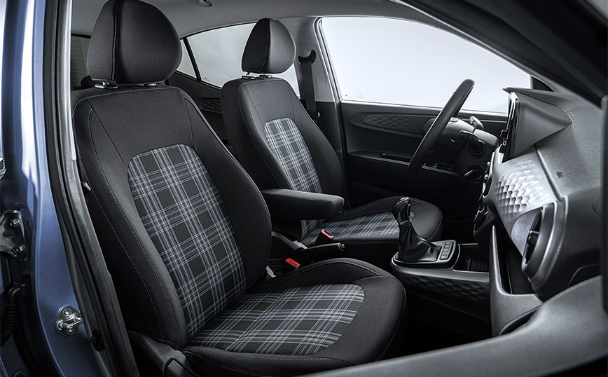 Παράλληλα, το νέο i10 μπορεί να εξοπλιστεί με μπλε ατμοσφαιρικό φωτισμό στα εμπρός καθίσματα. Ένα νέο πακέτο χρωμάτων, Purple Package, προσδίδει χαρούμενη αίσθηση στη σπορ εξωτερική σχεδίαση του αυτοκινήτου. Προσφέρει καθίσματα από ύφασμα tartan με κάθετες μωβ γραμμές καθώς και μωβ πινελιές στις ραφές και τους αεραγωγούς. Γκρι επιφάνειες με μωβ αντανακλάσεις, όπως στο ταμπλό και το κάτω μέρος της κεντρικής κονσόλας, προσθέτουν επιπλέον στυλ.