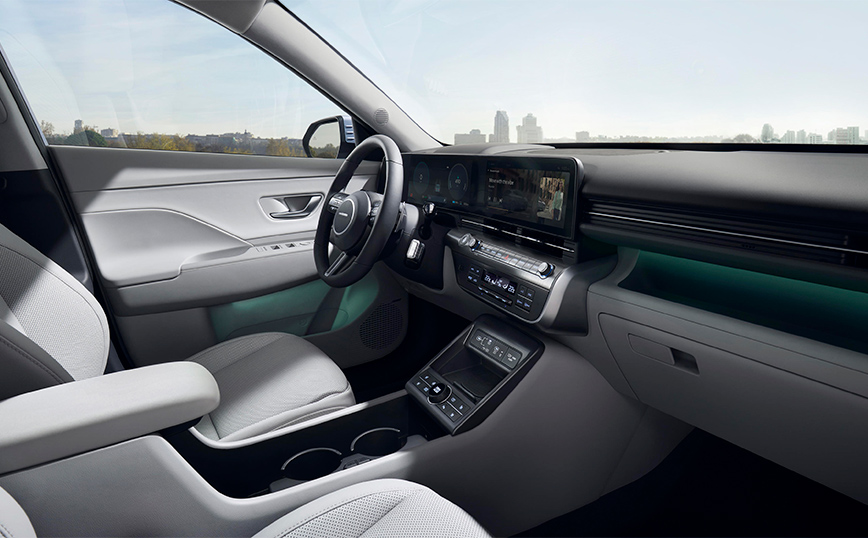 Χάρη στις αναβαθμισμένες διαστάσεις του μοντέλου και τη καινοτόμο αρχιτεκτονική που προέρχεται από το Kona EV, οι τεχνικοί κατάφεραν να σχεδιάσουν έναν μεγαλύτερο «χώρο διαβίωσης». Το οδηγοκεντρικό ταμπλό τονίζεται από ένα αιωρούμενο οριζόντιο C-Pad με ενσωματωμένες τις διπλές οθόνες 12,3 ιντσών που τονίζουν τον high-tech χαρακτήρα του νέου μοντέλου. Ο επιλογέας ταχυτήτων shift-by-wire έχει μεταφερθεί από την κεντρική κονσόλα στην κολόνα του τιμονιού, γεγονός που επιτρέπει περισσότερο χώρο αποθήκευσης στην κονσόλα.