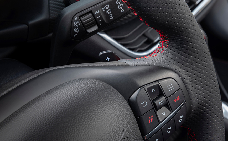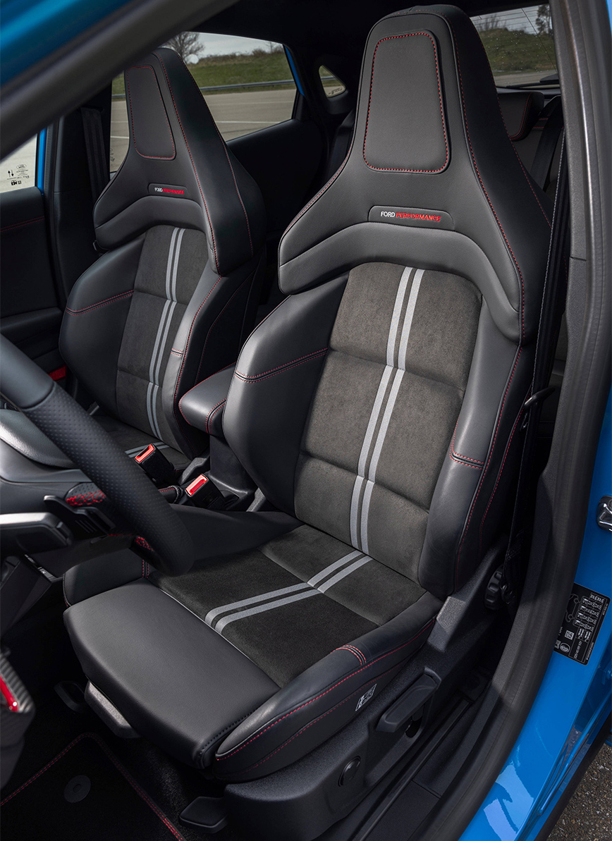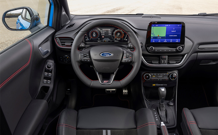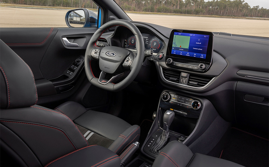 Στο εσωτερικό, τα στάνταρ χαρακτηριστικά περιλαμβάνουν σπορ καθίσματα εξελιγμένα από την Ford Performance, φινιρισμένα με premium συνθετικό υλικό Sensico με δερμάτινη αίσθηση, βάση ασύρματης φόρτισης, θερμαινόμενο παρμπρίζ Quickclear, εμπρός και πίσω αισθητήρες στάθμευσης, υαλοκαθαριστήρες με αισθητήρα βροχής, μόντεμ Ford Pass Connect, και σύστημα επικοινωνίας και ψυχαγωγίας SYNC 3 της Ford, συμβατό με Apple CarPlay και Android Auto. Οι διαθέσιμες τεχνολογίες υποστήριξης οδηγού περιλαμβάνουν Pre-Collision Assist με Active Braking, Active Park Assist, Cross Traffic Alert με Active Braking, και Intelligent Speed Limiter.