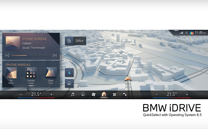 Το νέο iDrive με QuickSelect αποτελεί περαιτέρω εξέλιξη του Operating System 8 που τοποθετείται στα τρέχοντα μοντέλα BMW με Curved Display και βασίζεται στις νέας γενιάς infotainment των κεντρικών μονάδων, που είναι επίσης υπεύθυνες για την επεξεργασία γραφικών. Το νέο Operating System 8.5 θα εισαχθεί σταδιακά σε όλες τις σειρές μεσαίων, executive και πολυτελών μοντέλων της μάρκας και θα συνεχίσει να βασίζεται στο Linux, ενώ θα συνδυάζεται με τη μεγαλύτερη έκδοση του Curved Display. Αυτή τη στιγμή αναπτύσσεται η ψηφιακή εμπειρία στο ειδικό Curved Display των compact μοντέλων με το νέο λειτουργικό σύστημα Operating System 9, βασισμένο στο λογισμικό Android Open Source Project.