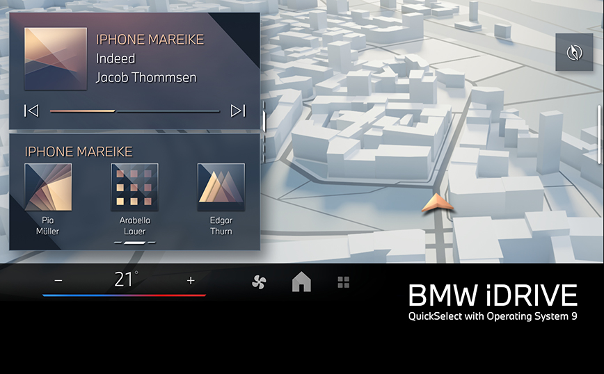 Η επόμενη γενιά του iDrive μετατρέπει την αρχική οθόνη του Curved Display σε ένα μόνιμα ορατό περιβάλλον εργασίας χρήστη. Εδώ μπορούν επίσης να εμφανίζονται ανά πάσα στιγμή άλλα γραφικά με δυνατότητα ατομικής διαμόρφωσης εναλλακτικά, αντί της προβολής χάρτη του συστήματος πλοήγησης.