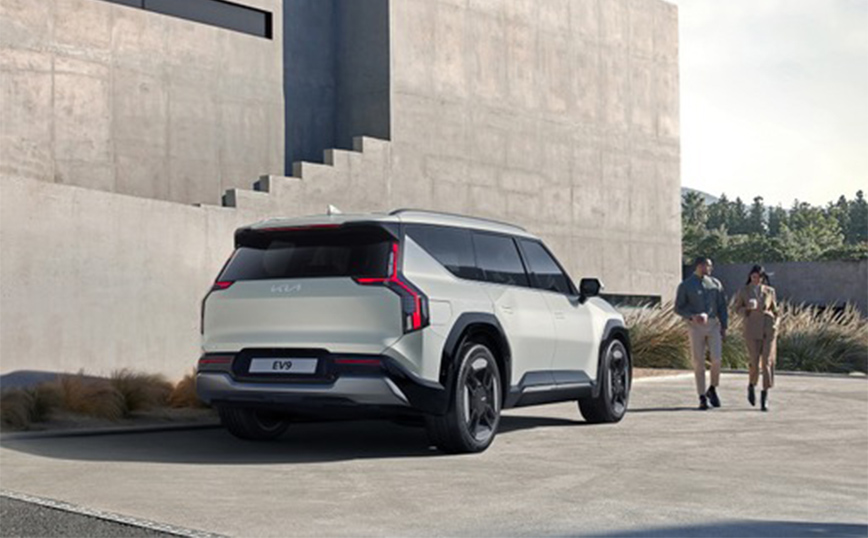 Στο πίσω μέρος, οι απλές γραμμές της πόρτας του χώρου αποσκευών, οι οποίες περιλαμβάνουν τα κομψά και λεπτά πίσω φώτα που αντικατοπτρίζουν τη σχεδίαση αυτών που βρίσκονται μπροστά, επιβεβαιώνουν την δυναμική εμφάνιση του EV9.