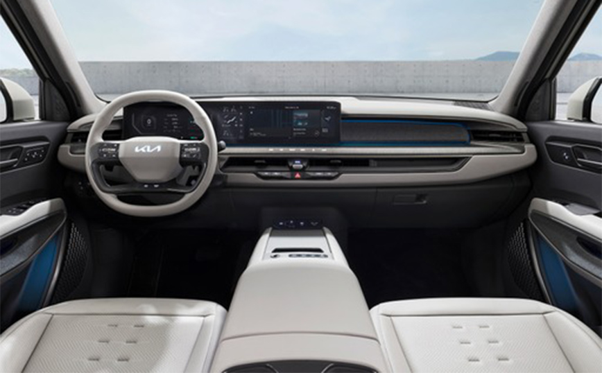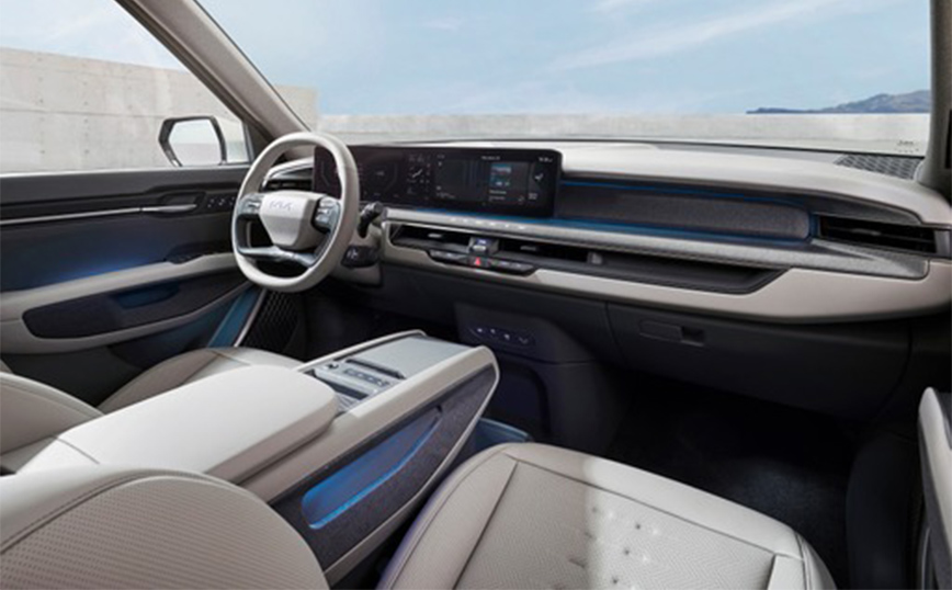 Η ευρύχωρη, ελαφριά και ευάερη καμπίνα του EV9 ενσωματώνει ένα κομψά απλό, αλλά κορυφαίας ποιότητας και εξαιρετικά φιλικό προς το χρήστη σχεδιασμό. Το ανοιχτό και πανοραμικό ταμπλό εκτείνεται από το τιμόνι μέχρι το κέντρο του αυτοκινήτου ενώ οι 2 οθόνες αφής 12,3 ιντσών βελτιώνουν την ψηφιακή εμπειρία, προσφέροντας πολύ εύκολα τον έλεγχο των λειτουργιών του οχήματος διασφαλίζοντας ότι τα φυσικά κουμπιά διατηρούνται στο ελάχιστο.