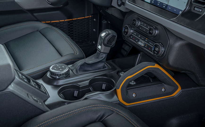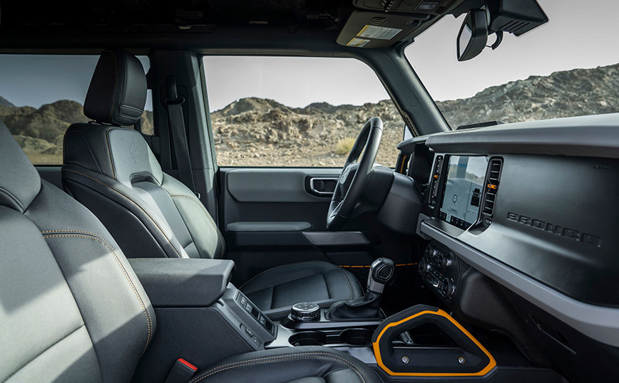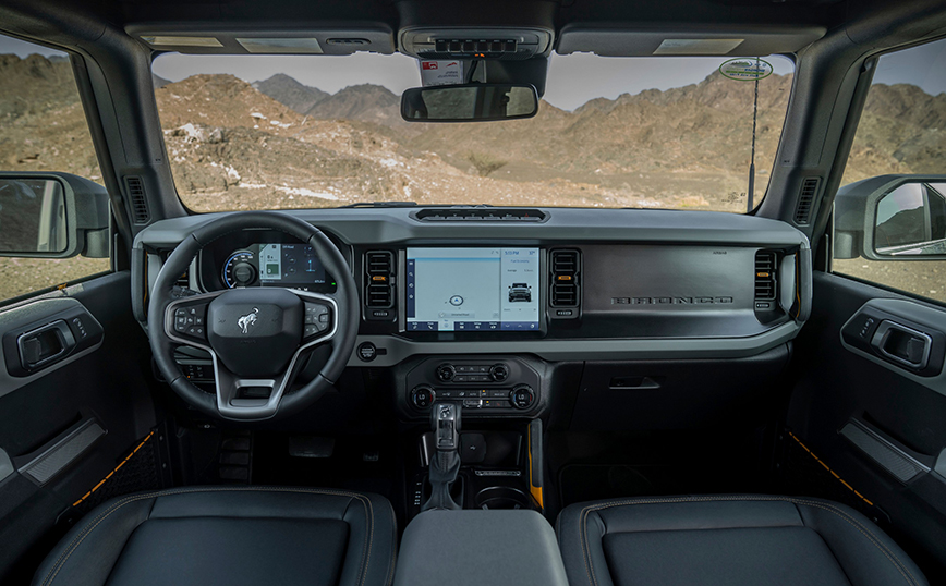 Το εσωτερικό είναι άκρως λειτουργικό με πληθώρα τεχνολογιών και στιβαρή κατασκευή ανθεκτική για σκληρή χρήση σε απαιτητικά περιβάλλοντα, ενώ η σχεδίαση του πίνακα οργάνων είναι επηρεασμένη από το Bronco πρώτης γενιάς και τα υλικά είναι επιλεγμένα με γνώμονα την αντοχή. Οι χειρολαβές είναι ενσωματωμένες στο ταμπλό και στην κεντρική κονσόλα για την άνεση των επιβατών σε όλες τις συνθήκες. Η κεντρική κονσόλα περιλαμβάνει μία επιφάνεια ασύρματης φόρτισης που είναι σχεδιασμένη για να διατηρεί ένα κινητό τηλέφωνο στη θέση του ακόμα και σε ακραίες γωνίες κλίσης.