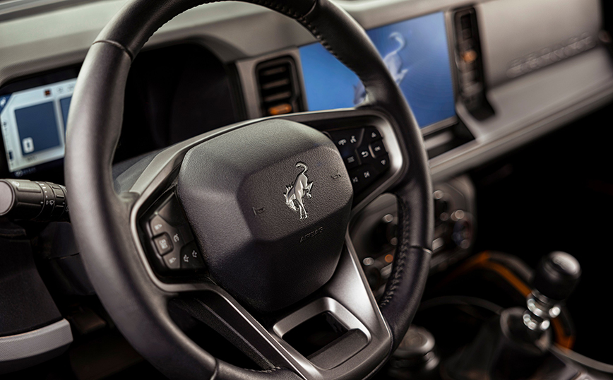 Μια TFT οθόνη 8 ιντσών στον πίνακα οργάνων συνδυάζεται με μία κεντρική οθόνη αφής LCD 12 ιντσών που διαθέτει την τελευταία γενιά του συστήματος επικοινωνίας και ψυχαγωγίας SYNC 43 το οποίο επωφελείται από τις ασύρματες ενημερώσεις λογισμικού Power-Up για βελτιωμένη λειτουργικότητα με την πάροδο του χρόνου. Το Bronco προσφέρει επίσης ειδικά σημεία για τη στερέωση στο πάνω μέρος του πίνακα οργάνων μιας βάσης, επιτρέποντας στους πελάτες να συνδέουν συσκευές, όπως κάμερες ή κινητά τηλέφωνα, μέσω συνδέσεων τροφοδοσίας των 12-volt και θυρών USB. Η συμβατότητα των Apple CarPlay και Android Auto είναι στάνταρ μαζί με ένα ηχοσύστημα B&O Premium Sound System με 10 ηχεία, συμπεριλαμβανομένου ενός subwoofer. Επίσης, η εφαρμογή FordPass προσφέρει ισχυρή συνδεσιμότητα και ανεμπόδιστη ενσωμάτωση με το σύστημα SYNC 4.