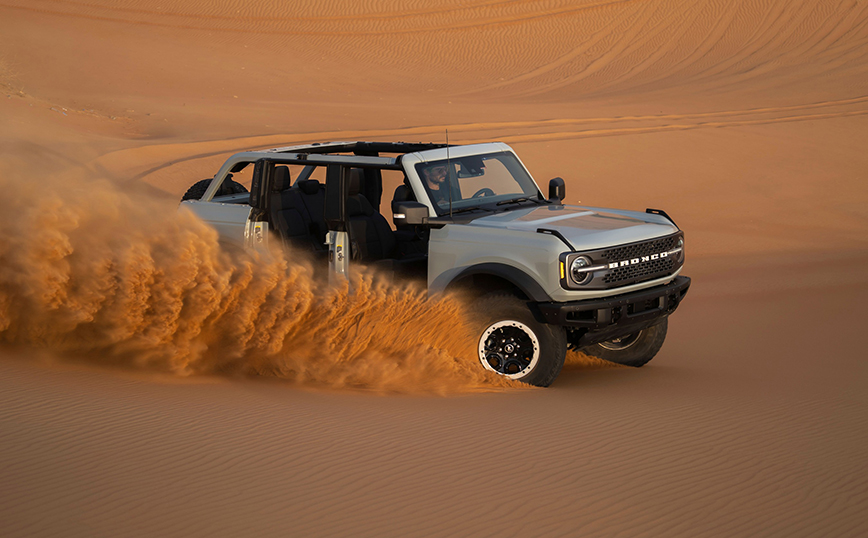 Το Bronco προσφέρεται στους ευρωπαίους πελάτες σε αυστηρά περιορισμένο αριθμό αντιτύπων και είναι διαθέσιμο στην hardcore έκδοση Outer Banks και στην Badlands που ξεχωρίζει για τις κορυφαίες ικανότητές της σε ακραίες εκτός δρόμου διαδρομές. Και οι δύο τροφοδοτούνται από τον κινητήρα EcoBoost V6 2.7 λίτρων που αποδίδει ισχύ 335 ίππων και ροπή 563Nm. Οι σύγχρονες τεχνολογίες κίνησης χαρίζουν στο Bronco το προσωνύμιο “G.O.A.T.” (Goes Over Any Type of Terrain), συμπεριλαμβανομένων των εξελιγμένων συστημάτων μετάδοσης κίνησης με μακριές και κοντές σχέσεις, του Trail Control και των έως και επτά προφίλ οδήγησης.