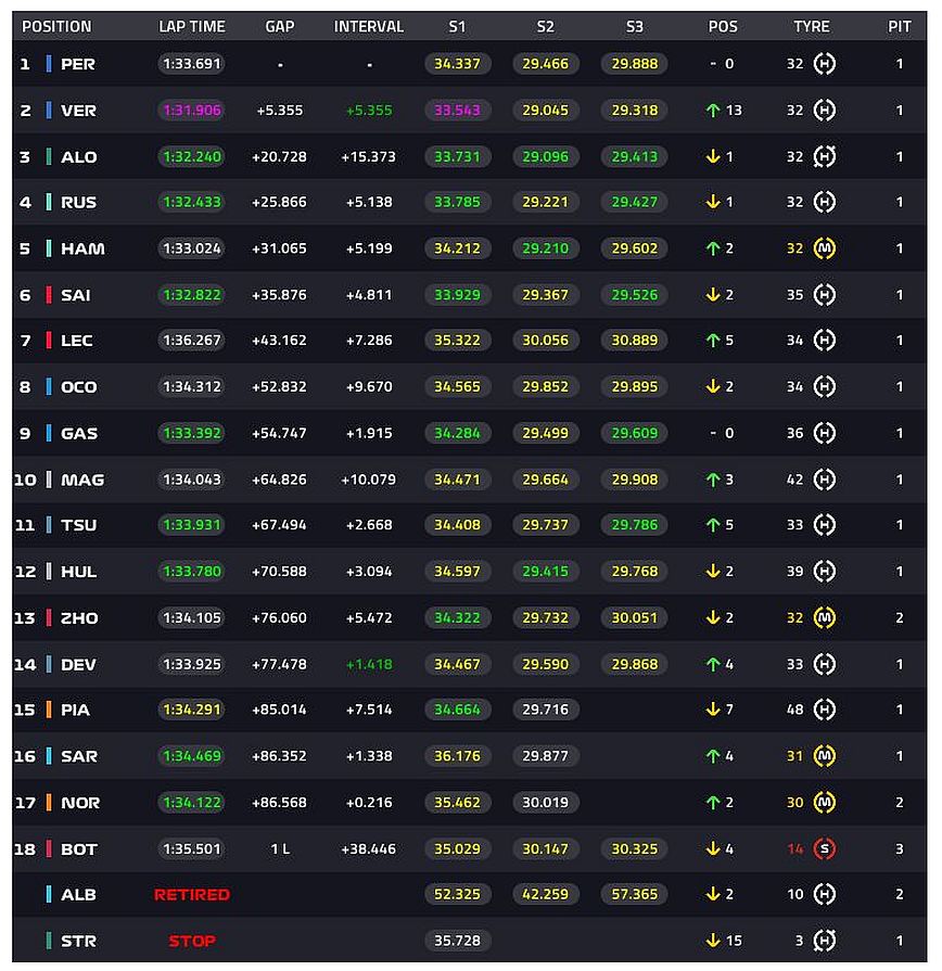 Ο Σέρχιο Πέρεζ είχε πάρει το Σάββατο (18/3) την pole position για το γκραν πρι της Formula 1 στη Σαουδική Αραβία και μία μέρα μετά πήρε και τη νίκη και μάλιστα εύκολα, με τον Μαξ Φερστάπεν, επίσης με Red Bull, να τερματίζει στη 2η θέση και τον Τζορτζ Ράσελ να παίρνει την 3η, αφού ο Φερνάντο Αλόνσο με Aston Martin δέχθηκε ποινή και έμεινε 4ος.