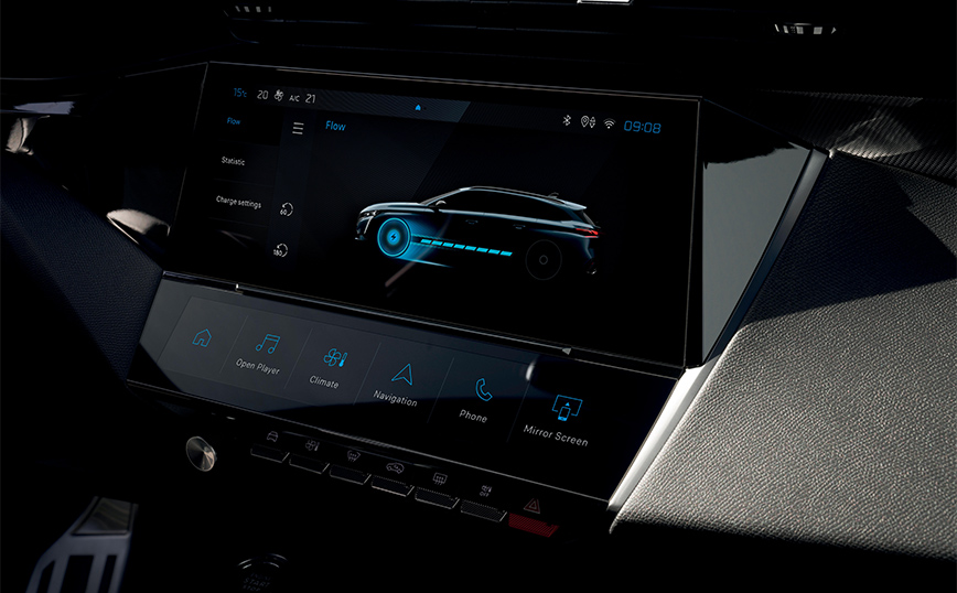 - Μια μεγάλη κεντρική οθόνη αφής, εύκολα προσβάσιμη και ορατή, η οποία επιτρέπει στον οδηγό να διαχειρίζεται τις κύριες λειτουργίες του αυτοκινήτου.