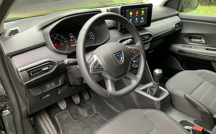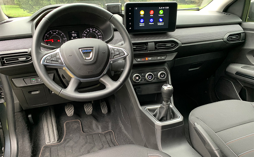 Το μοντέλο έχει πολλά κοινά με το Sandero και το Duster, όπως η οθόνη αφής του infotainment, η εύκολη ενσωμάτωση των smarphones και οι καλυμμένες με ύφασμα επιφάνειες (κυρίως στις πόρτες). Τα σκληρά πλαστικά έχουν καλή συναρμογή και η έξυπνη στήριξη για το κινητό τηλέφωνο είναι κάτι ιδιαίτερα εξυπηρετικό. Αξίζει εδώ να σημειώσουμε ότι, οι πίσω θέσεις δεν υστερούν σε ανέσεις (με μια ποτηροθήκη για τον καθένα), φάρδος και ορατότητα, γεγονός για το οποίο ευθύνεται η διάταξη της 2ης και 3ης σειράς που προαναφέραμε, ενώ τα κλειστοφοβικά αισθήματα που πιθανόν να αναπτύξουν οι επιβάτες της 3ης σειράς, αποφεύγονται από το φινιστρίνι που ανοίγει προς τα έξω.