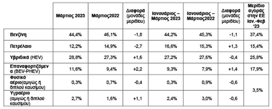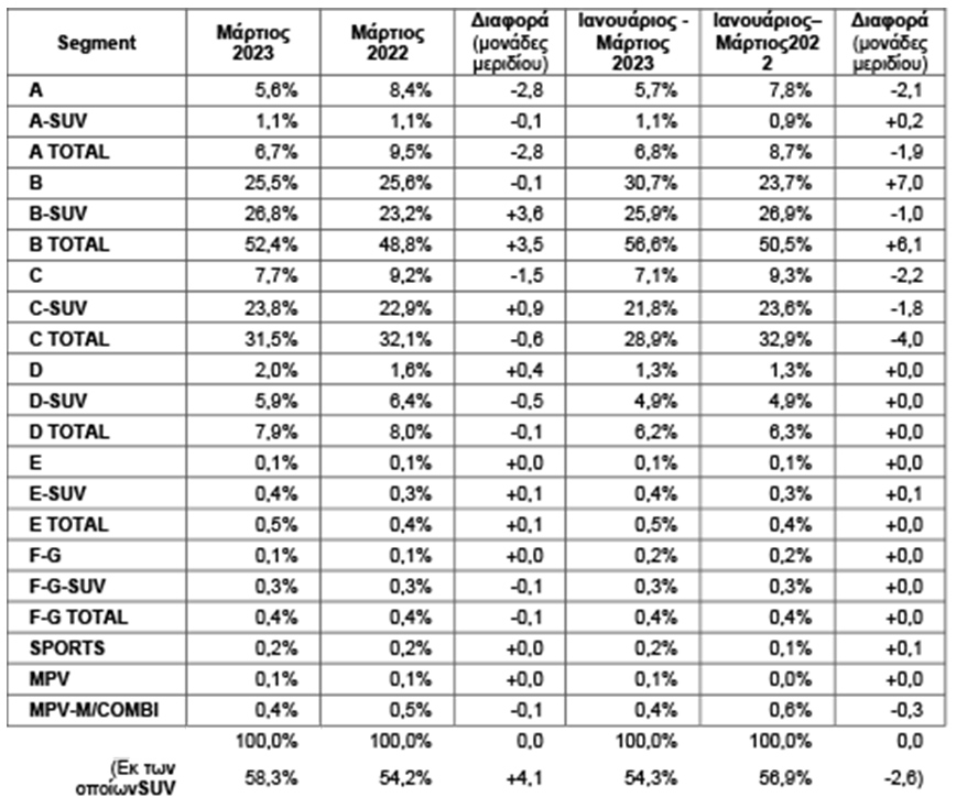 Έτσι, σύμφωνα με πρώτους υπολογισμούς, η πρόοδος στα segments επιβατικών και στην κατανομή ανά καύσιμο, ως το Μάρτιο, έχει ως εξής: