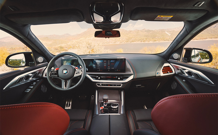 Τα καθίσματα πολλαπλών λειτουργιών M, τα προστατευτικά γονάτων, το ειδικό περιεχόμενο M στην κυρτή οθόνη Curved Display και στο στάνταρ head-up display, ο χαρακτηριστικός μοχλός επιλογέας ταχυτήτων M και ένας ειδικός πίνακας ελέγχου M στην κεντρική κονσόλα, είναι τα κύρια χαρακτηριστικά ενός cockpit που παραπέμπει σε σπορ αυτοκίνητο. Το μπουτόν M Hybrid χρησιμοποιείται για την επιλογή του επιθυμητού προφίλ λειτουργίας του συστήματος κίνησης, ενώ το κουμπί Setup παρέχει άμεση πρόσβαση στη διαμόρφωση του συστήματος κίνησης, του πλαισίου, του συστήματος διεύθυνσης, του συστήματος πέδησης και του M xDrive, καθώς και τη ρύθμιση του επιπέδου ανάκτησης ενέργειας κατά την πέδηση. Το δερμάτινο τιμόνι M διαθέτει διακοσμητικά στοιχεία σε μαύρο χρώμιο, καθώς και μπουτόν M και χειριστήρια αλλαγής ταχυτήτων (shift paddles) με carbon ένθετα, των οποίων τα σύμβολα ‘+’ και ‘-‘ είναι σε κόκκινο χρώμα. Ένα αποκλειστικό ειδικό χαρακτηριστικό της XM Label Red είναι το σύμβολο που προσδιορίζει το Boost Mode στο αριστερό χειριστήριο αλλαγής ταχυτήτων.