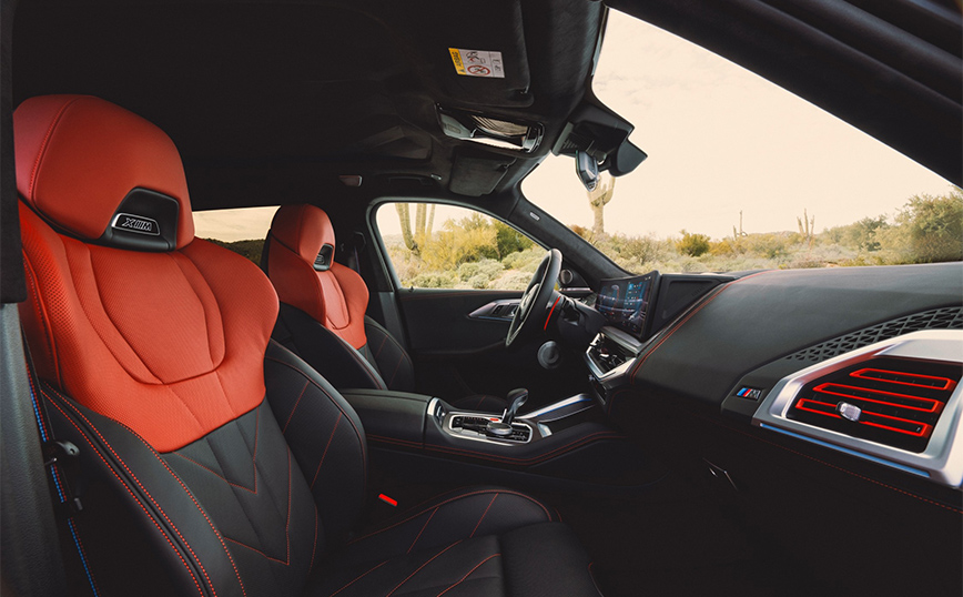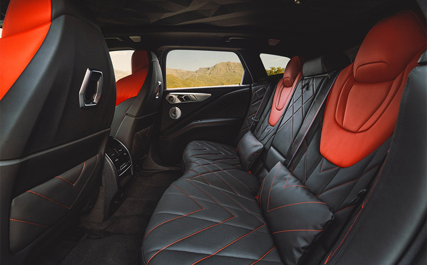 Η αίσθηση ευρυχωρίας, τα υψηλής ποιότητας υλικά και ο πρωτοποριακός σχεδιασμός μετατρέπουν το πίσω τμήμα της πανίσχυρης έκδοσης σε ένα αποκλειστικό M Lounge. Οι προαιρετικά θερμαινόμενες πλάτες καθισμάτων που επεκτείνονται αρκετά στα πλαϊνά της καμπίνας και τα μαξιλάρια από δέρμα Merino με κόκκινες ραφές αντίθεσης και ένα σήμα “XM”, προσφέρουν στους επιβάτες πολυτελή επίπεδα άνεσης. Η ανάγλυφη επένδυση οροφής είναι απολύτως μοναδική με την τρισδιάστατη πρισματική δομή, το περίγραμμα σε στυλ πασπαρτού και τις 100 μονάδες LED για φωτισμό. Ο ατμοσφαιρικός φωτισμός περιβάλλοντος, ο αυτόματος κλιματισμός τεσσάρων ζωνών, το σύστημα ήχου Surround Harman Kardon και το σύστημα Travel & Comfort είναι επίσης στάνταρ, ενώ προαιρετικά διατίθενται το σύστημα ήχου Surround Bowers & Wilkins Diamond με ενισχυτή 1.475 Watt και τέσσερα επιπλέον ηχεία στην περιοχή της οροφής.