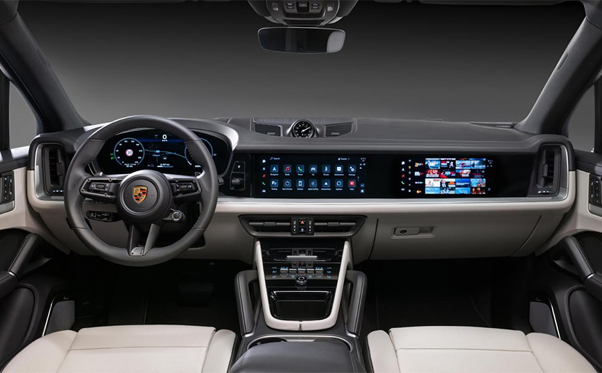 Για πρώτη φορά, το επανασχεδιασμένο ταμπλό της Cayenne περιλαμβάνει έναν πλήρως ψηφιακό πίνακα οργάνων 12,6″ καμπυλόγραμμου σχεδιασμού με αυτόνομο design και επιλογές διαφοροποιημένης προβολής. Διατίθεται προαιρετικά μια βελτιστοποιημένη οθόνη προβολής στο παρμπρίζ. Η στάνταρ κεντρική οθόνη 12,3″ του συστήματος διαχείρισης επικοινωνιών Porsche (PCM) ενσωματώνεται αρμονικά στο νέο ταμπλό προσφέροντας τη δυνατότητα πρόσβασης σε όλες τις σημαντικές λειτουργίες του οχήματος.