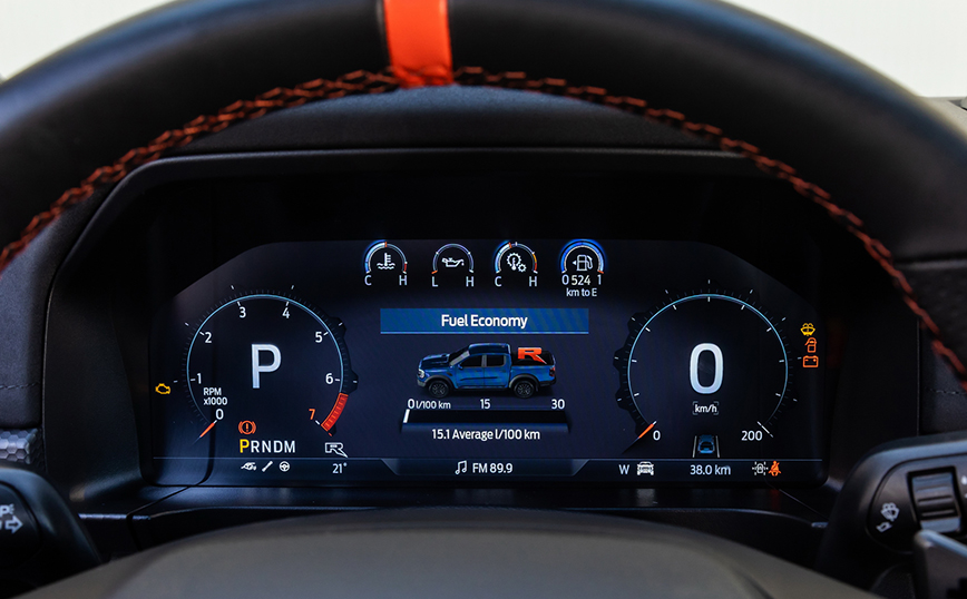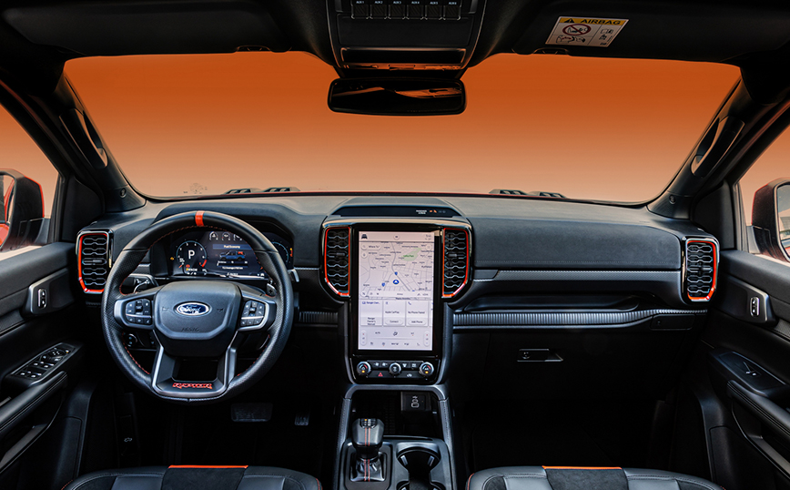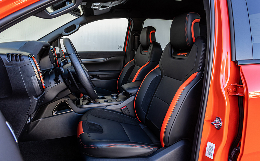 Το εσωτερικό, όμως, είναι ιδιαιτέρως αναβαθμισμένο, περίπου στα χνάρια του Mach-E. Δεσπόζει μια μεγάλη κάθετη οθόνη 12,4” στο κέντρο του ταμπλώ , η οποία έχει τον ρόλο του… συντονιστή στο SYNC 4A σύστημα πολυμέσων νέας γενιάς της μάρκας. Ο πλήρως ψηφιακός πίνακας οργάνων πληροφορεί τον οδηγό για το σύνολο των δυνατοτήτων που έχει στη διάθεσή του, τις οποίες μπορεί να τις διαχειριστεί από το πολλαπλής λειτουργικότητας τιμόνι. Αξιοσημείωτο στοιχείο, οι διακόπτες στην οροφή του εσωτερικού, από όπου επιτυγχάνεται η διαχείριση έξτρα εξοπλισμού, λόγου χάριν φώτα οροφής, ή η παροχή ρεύματος για τη σκηνή που μπορεί να τοποθετηθεί μετατρέποντας το Raptor σε… τροχόσπιτο.