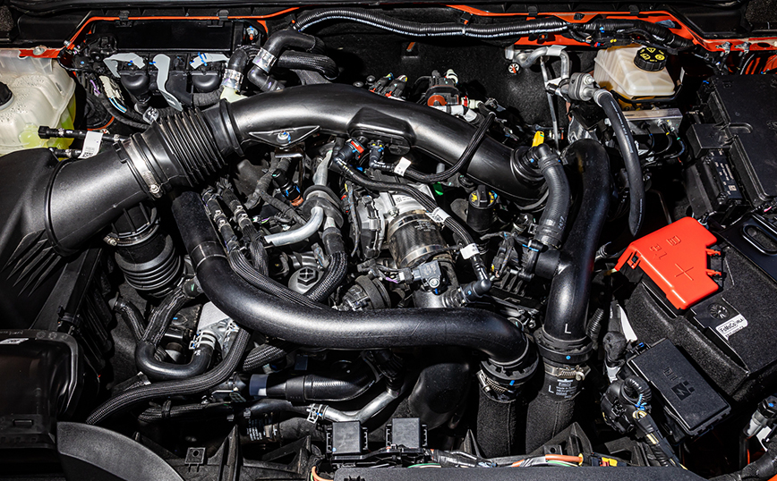 Κάτω από τα καπό, υπάρχει ένας 3λιτρος, V6, twin-turbo βενζινοκινητήρας 3.0 λίτρων (EcoBoost), που στην έκδοση που οδηγήσαμε αποδίδει 292 ίππους ισχύος και 491 Nm ροπής, με νέο σύστημα anti-lag, που (σύμφωνα με τη Ford) διατηρεί για έως και τρία δευτερόλεπτα την πλήρωση των twin turbo, όταν ο οδηγός αποφασίσει να αφήσει το πόδι από το γκάζι, ενώ επιτρέπει μεγαλύτερη τιμή επιτάχυνσης στις εξόδους στροφών ή κατά την αλλαγή σχέσεων στο κιβώτιο.