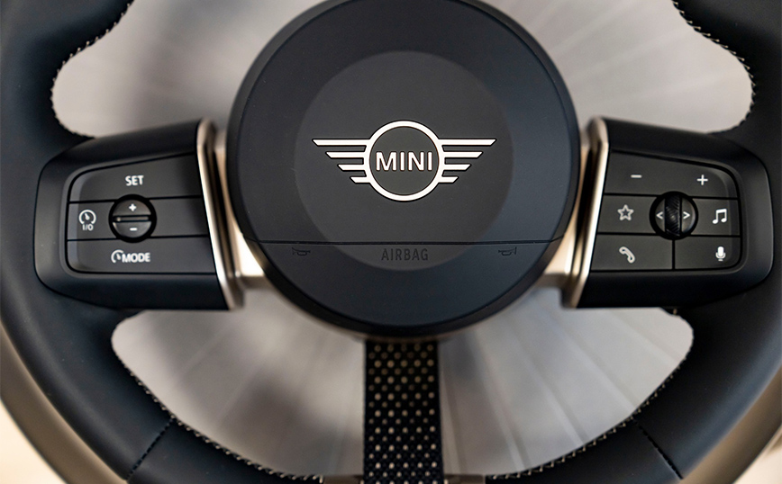Εκτός από την κεντρική οθόνη, το τιμόνι της επόμενης οικογένειας μοντέλων υιοθετεί εντελώς νέα σχεδίαση. Η βασική έκδοση διαθέτει τιμόνι δύο ακτίνων. Η προαιρετική έκδοση προσθέτει ένα διακριτικό υφασμάτινο φινίρισμα ως τρίτο στοιχείο σε συνδυασμό με τη σπορ γεωμετρία. Η επερχόμενη οικογένεια μοντέλων Mini εξάπτει το ενδιαφέρον με μία ποικιλία βιώσιμων υλικών και χρωμάτων υψηλής ποιότητας, καθώς και με τα καινοτόμα σχέδια υφασμάτων.