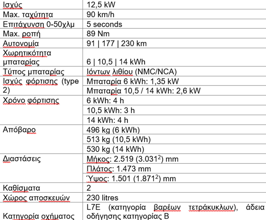 Επίσης, αυτό το ελαφρύ ηλεκτρικό όχημα κατηγορίας L7e, έχει μέγιστη ταχύτητα 90 χλμ/ώρα και χωρητικότητα πορτμπαγκάζ 230 λίτρα. Είναι το πρώτο όχημα αυτής της κατηγορίας που διαθέτει αυτοφερόμενο πλαίσιο, προσφέροντάς του εξαιρετική ασφάλεια και δυναμική οδήγηση.