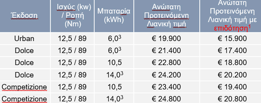 Ο αναλυτικός πίνακας με τις προτεινόμενες τιμές λιανικής και για τις 3 μπαταρίες μαζί με το όφελος απόκτησης ηλεκτρικού οχήματος που προβλέπει το πρόγραμμα επιδότησης «Κινούμαι Ηλεκτρικά 2», έχει ως εξής: