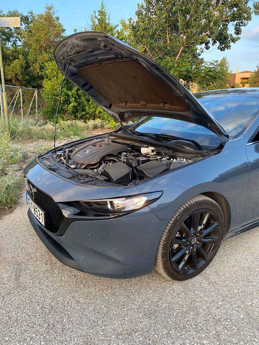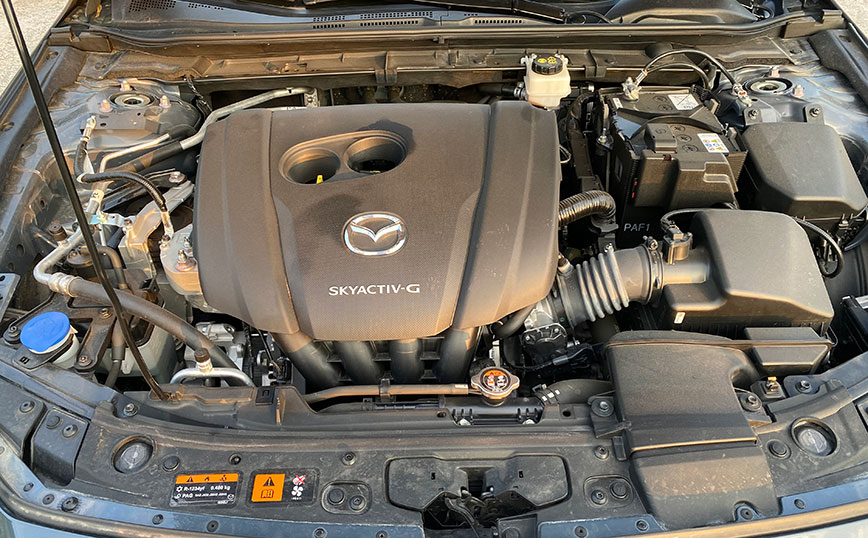 Κάτω από το μακρύ, επικλινές καπό βρίσκεται η καρδιά του μοντέλου, δηλαδή το υπερσύγχρονο τεχνολογικά 2λιτρο ατμοσφαιρικό 4κύλινδρο σύνολο, με την κωδική ονομασία e-Skyactiv G και απόδοση 150 ίππων στις 6.000 στροφές, ενώ η μέγιστη ροπή των 213 Nm αποδίδεται ψηλά (4.000 στροφές). Για την οικονομία κατανάλωσης και τη μείωση των ρύπων, φροντίζουν τόσο το ήπια υβριδικό σύστημα των 24V που βοηθά την λειτουργία του Start/Stop, όσο και το σύστημα απενεργοποίησης των δύο κυλίνδρων (1 και 4) στα πολύ χαμηλά φορτία.
