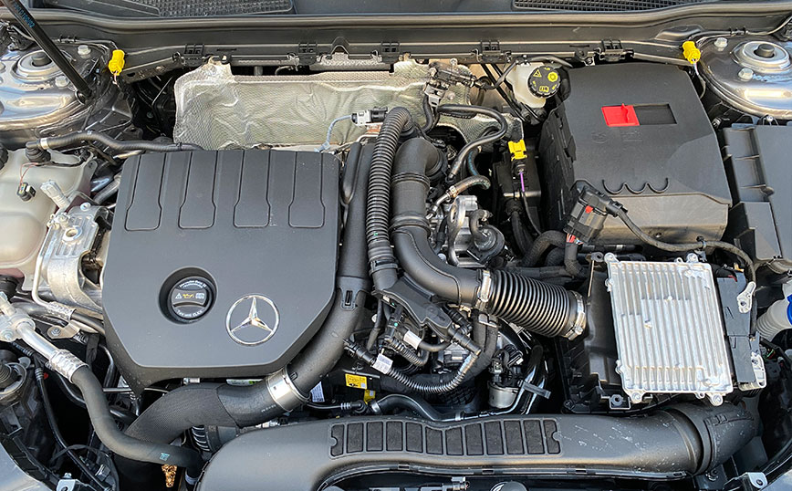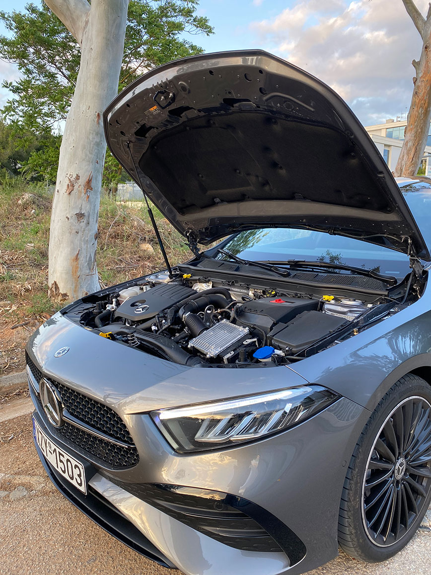 Η Α 200 είναι η βάση στην οικογένεια Α-Class για την χώρα μας και χρησιμοποιεί τον γνωστό πλέον 4κύλινδρο, 1.300άρη τούρμπο κινητήρα (προϊόν συνεργασίας με την Renault), ο οποίος παίρνει βοήθεια από ένα ήπια υβριδικό σύστημα κίνησης 48V με ενσωματωμένη μίζα/γεννήτρια. Η βοήθεια αυτή αποτιμάται σε επιπλέον 13,6 ίππους και έτσι η συνολική απόδοση του κινητήριου συστήματος είναι 163 ίπποι με μέγιστη ροπή 270 Nm. Το έργο αυτό (με προφίλ comfort, eco, sport & individual) μεταφέρεται στους εμπρός τροχούς με ένα μερικές φορές (σε προφίλ eco) απότομο στη λειτουργία και διστακτικό σε απόκριση αυτόματο κιβώτιο διπλού συμπλέκτη με 7 σχέσεις. Υπάρχει και δυνατότητα αλλαγής των μέσω χειριστήριων (paddles) που βρίσκονται πίσω από τις οριζόντιες ακτίνες του τιμονιού.