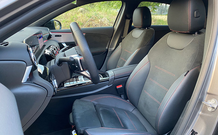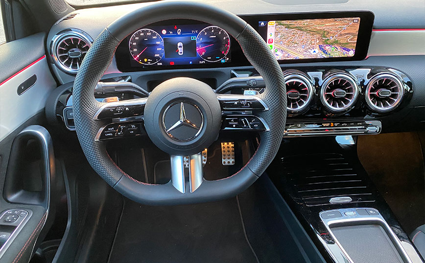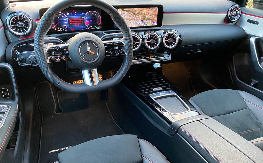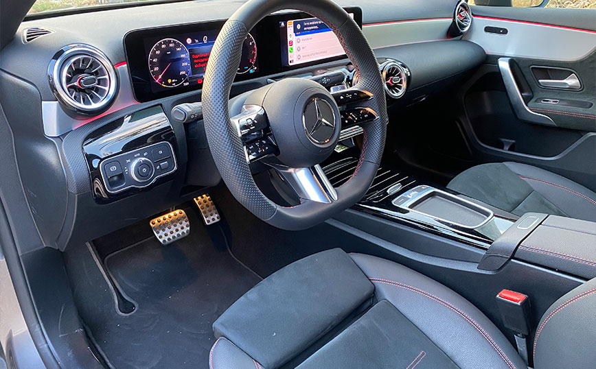 Ο πολυτελής χαρακτήρας του μοντέλου αποτυπώνεται κυρίως στο εσωτερικό, με σχεδίαση, ποιότητα υλικών/συναρμογής και εξοπλισμό που παραπέμπει σε μοντέλα ανώτερης κατηγορίας και δικαιολογεί – ως ένα σημείο – την αλμυρή τιμή κτήσης. Σημείο αναφοράς και εδώ οι δύο οθόνες 10,25 ιντσών που υποστηρίζουν την τελευταία γενιά του συστήματος πολυμέσων MBUX, με δυνατότητα παραμετροποίησης μέσω των προγραμμάτων Classic, Sport και Discreet. Οι οθόνες πλαισιώνονται από αεραγωγούς αεροπορικού τύπου και από μια μεταλλική φάσα ανάμεσα στα εύκαμπτα πλαστικά του ταμπλό.