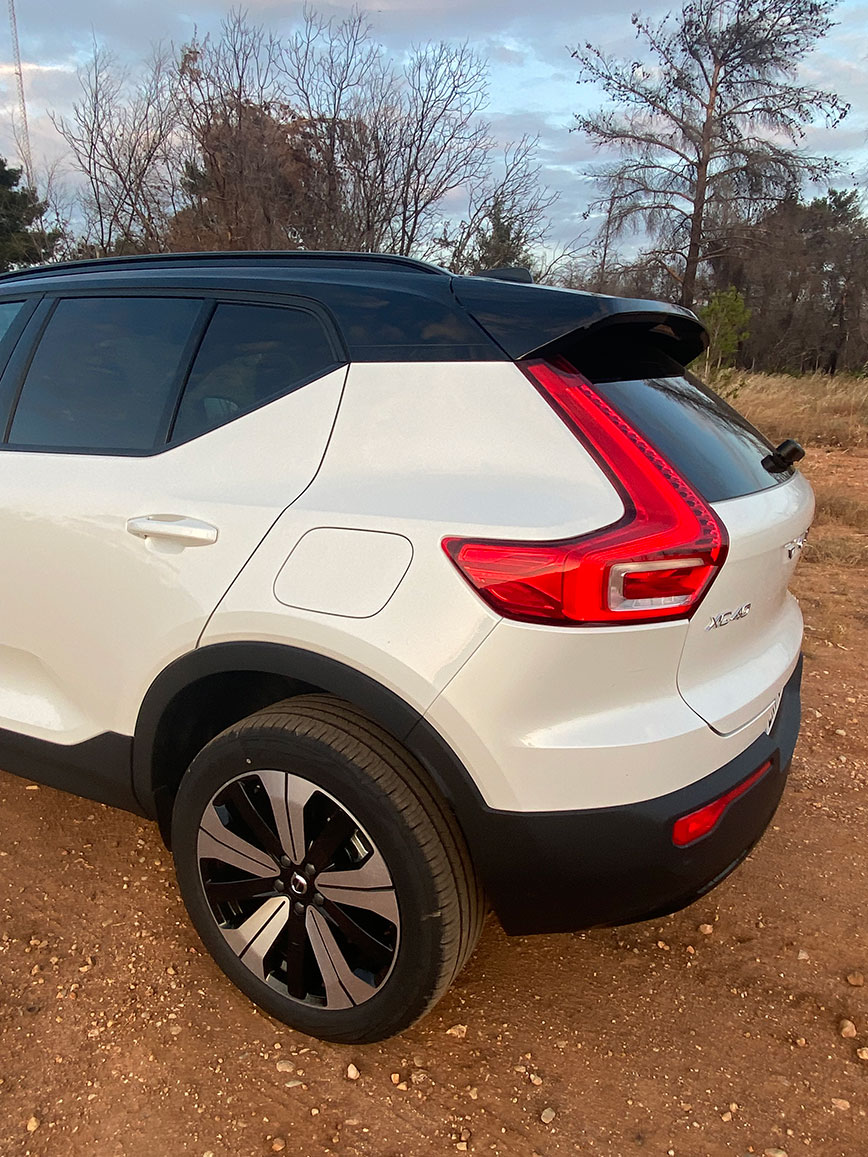 Το ηλεκτρικό XC40 διακρίνεται από την κλειστή μάσκα στο χρώμα του αμαξώματος, τον λογότυπο Recharge Twin, το δυσδιάκριτο ανάγλυφο “Recharge” στην πίσω κολόνα, και τις αεροδυναμικής σχεδίασης ζάντες αλουμινίου 19 ιντσών. Στο εμπρός μέρος της μάσκας υπάρχουν οι αισθητήρες των συστημάτων ενεργητικής ασφάλειας νέας γενιάς ADAS, ενώ τα λοιπά σχεδιαστικά χαρακτηριστικά παραμένουν ίδια με του «απλού» XC40, με τα εμπρός φώτα LED & τα φώτα ημέρας να παραπέμπουν στο σφυρί του Σκανδιναβού Θεού του κεραυνού και της αστραπής Θωρ. Επίσης, παρατηρώντας το προφίλ του αμαξώματος, η μόνη διαφορά σε σχέση με το θερμικό XC40 είναι η μειωμένη κατά 30 χλστ. απόσταση από έδαφος (176 χλστ.), ενώ στο πίσω μέρος λείπει η μπούκα της εξάτμισης.