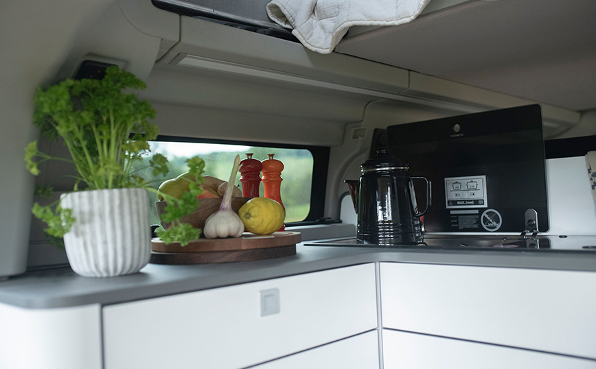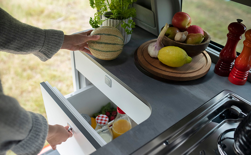 Μια βελτιστοποιημένη κουζίνα με διάταξη σε σχήμα L κάνει το μαγείρεμα πιο ευχάριστο. Μια νέα και πρακτική συρταριέρα ψύξης διευκολύνει την πρόσβαση στο περιεχόμενο και είναι αρκετά μεγάλη ώστε να χωράει μπουκάλια σε όρθια θέση. Σε συνδυασμό με τη νέα ενσωματωμένη μονάδα εστιών και νεροχύτη (τώρα με στάνταρ ζεστό νερό) η λιτή σχεδίαση των επιφανειών προσφέρει 20% περισσότερο χώρο στον πάγκο εργασίας. Τα μάνταλα με απαλό κλείσιμο και οι αναδυόμενες λαβές προστατεύουν τα δάχτυλα των παιδιών και αποσβένουν το θόρυβο κατά την οδήγηση.