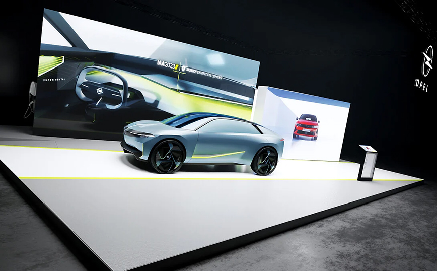 Η «Bold & Pure» σχεδιαστική φιλοσοφία της Opel κυριαρχεί και στα δύο περίπτερα. Ημιδιαφανή υλικά και μεγάλες οθόνες καλωσορίζουν το κοινό και συμβολίζουν την εξέλιξη της εταιρικής ταυτότητας της μάρκας. Οι χρωματισμοί, τα υλικά και οι υφές εναρμονίζονται με το Experimental concept. Επιπλέον, οι οθόνες προσφέρουν μια διαδραστική ψηφιακή εμπειρία στους επισκέπτες. Χρησιμοποιώντας το Opel AI (τεχνητή νοημοσύνη για την παραγωγή εικόνας, που αναπτύχθηκε ειδικά για την μάρκα) και ένα ειδικό τερματικό που βρίσκεται στο περίπτερο, μπορούν να δημιουργήσουν διάφορα back grounds για την οθόνη πίσω από το concept car. Στη συνέχεια, μπορούν να κατεβάσουν την εικόνα μέσω κωδικού QR στο smartphone τους και να τη μοιραστούν στα μέσα κοινωνικής δικτύωσης.