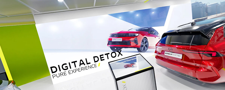 Η χρήση των οθονών ως διαχωριστικών τοίχων υπογραμμίζει επίσης την έννοια του «Detox» στα δύο περίπτερα της Opel. Δεν υπάρχουν περιττά υλικά, αντίθετα η μινιμαλιστική και «διαφανής» παρουσία της μάρκας τοποθετεί στο επίκεντρο τα 3 ηλεκτροκίνητα μοντέλα που παρουσιάζονται για πρώτη φορά στο κοινό.
