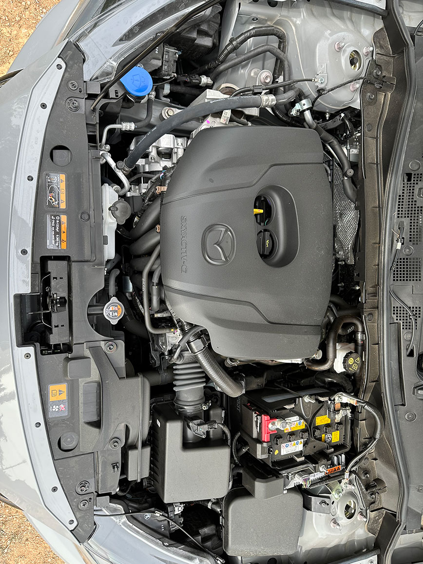 Το Mazda 2 κινείται από ένα ήπιο υβριδικό σύστημα που έχει σαν βάση τον κινητήρα Skyactiv 1.5, ο οποίος με άμεσο ψεκασμό και ψηλή σχέση συμπίεσης (15:1) αποδίδει 90 ίππους και συνδυάζεται με σύστημα ανάκτησης ενέργειας κατά την επιβράδυνση και γεννήτρια/μίζα για την υποβοήθηση στις εκκινήσεις και την επιτάχυνση. Αυτή η γεννήτρια δεν τροφοδοτείται από μπαταρία αλλά από πυκνωτή ο οποίος έχει την ικανότητα γρήγορης φόρτισης και εκφόρτισης, αλλά και μεγαλύτερη διάρκεια ζωής.