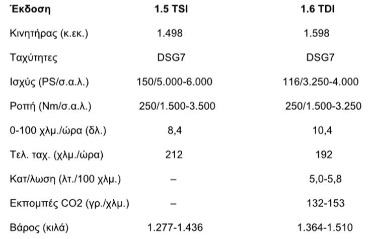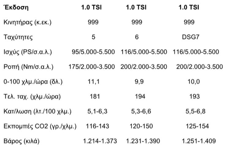 Ανάλογες ήταν και οι εντυπώσεις της οδήγησης του 1.0 TSI των 116 ίππων, με το χειροκίνητο 6άρι κιβώτιο, που δίνει ένα δέκατο του δευτερολέπτου καλύτερο 0-100, συν ένα χιλιόμετρο τελικής ταχύτητας και ελάχιστα μικρότερη κατανάλωση, αλλά δεν έχει την άνεση και την χαλαρότητα της οδήγησης του DSG. Πέραν αυτού, η κατανάλωση είναι σχεδόν στα ίδια επίπεδα, ψηλότερα από τις «υποσχέσεις» του κατασκευαστή και στην περίπτωσή μας, είδαμε μέση τιμή 7,7 λίτρων, παρά το ότι δεν πιέσαμε πολύ τον κινητήρα και τα περισσότερα χιλιόμετρα τα κάναμε σε αυτοκινητόδρομο.