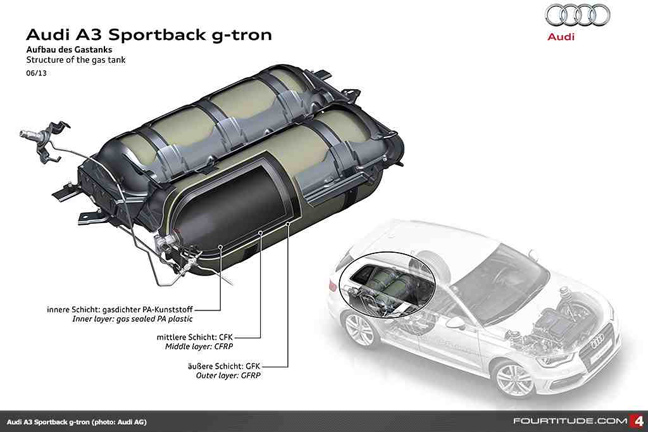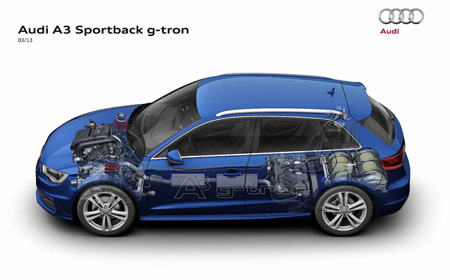 Οι κινητήρες διπλού καυσίμου είναι η μόδα της εποχής και μια «προσπάθεια» απομάκρυνσης του πλήρους εξηλεκτρισμού, που ακόμα έχει προβλήματα χρηστικότητας. Στην κατεύθυνση αυτή η έκδοση Α3 Sportback με τα διαφημιστικά αυτοκόλλητα g-tron, φανερώνει τη χρήση καθαρού, φθηνού καυσίμου, όπως το φυσικό αέριο.
