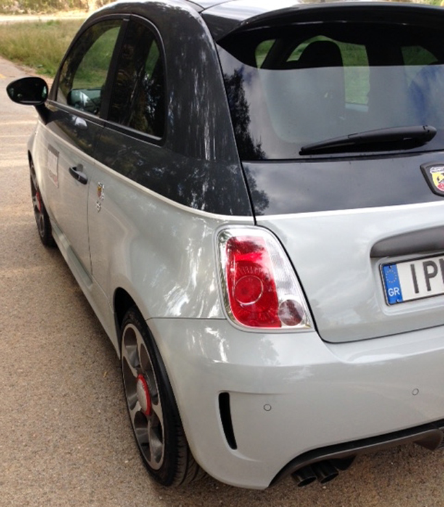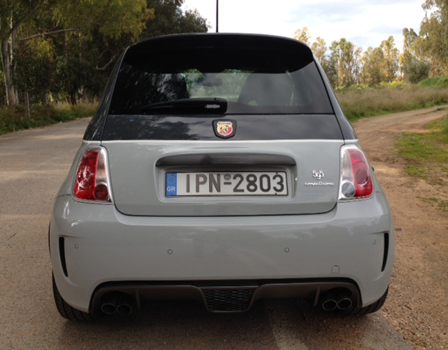 Μια και μόνη ματιά αρκεί για να καταλάβεις περί τίνος πρόκειται. Το ανασχεδιασμένο εμπρός μέρος με μεγαλύτερες εισαγωγές αέρα στον προφυλακτήρα και στη μάσκα σε συνδυασμό με το διαχύτη πίσω που φιλοξενεί τις τετραπλές μπούκες της εξάτμισης Record Monza, κάνουν σαφές ότι, το αυτοκίνητο της δοκιμής μας είναι κάτι περισσότερο από ένα 500αράκι. Πιστοποίηση τα λογότυπα 595 με το σήμα της Abarth στο πλάι, το Competizione στο πίσω μέρος, οι 17άρες ζάντες, η μεγάλη αεροτομή και οι κόκκινες δαγκάνες φρένων.