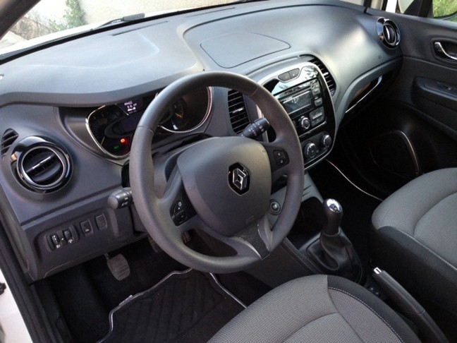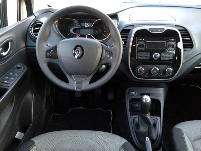 Στο εσωτερικό το Captur θυμίζει σαφώς το Clio στον πίνακα οργάνων, τους διακόπτες κλιματισμού και σε πολλούς περιφερειακούς διακόπτες, αλλά τελικά το ταμπλό διαφοροποιείται με έμφαση στην πρακτικότητα. Πάνω από την κεντρική κονσόλα υπάρχει ένας βαθύς αποθηκευτικός χώρος με καπάκι, ενώ μπροστά από τα γόνατα του συνοδηγού το ντουλαπάκι είναι πλέον ένα ευρύχωρο, ανθεκτικό και πρακτικό συρτάρι χωρητικότητας 11 λτ..