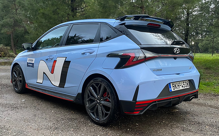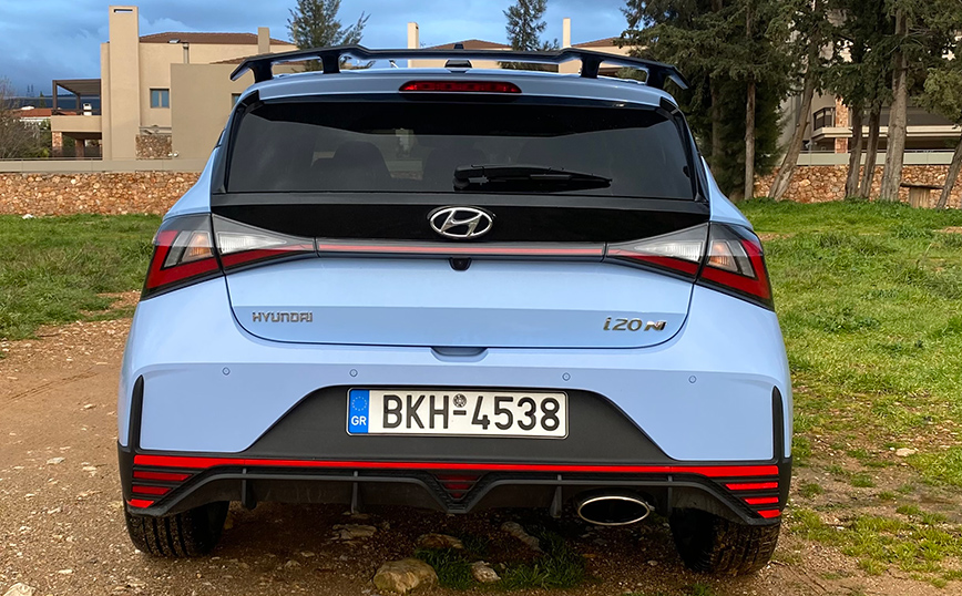 Στο πίσω μέρος κυριαρχούν η μεγάλη αεροτομή και ο ενσωματωμένος στον προφυλακτήρα διαχύτης αέρα. Το i20 N φορά νέας σχεδίασης 18άρες ζάντες με ελαστικά Pirelli P-Zero διάστασης 215/40 (εξελιγμένα ειδικά για το μοντέλο), ενώ τα διαθέσιμα εξωτερικά χρώματα είναι 6, με το «δικό μας» να είναι βαμμένο σε Performance Blue.